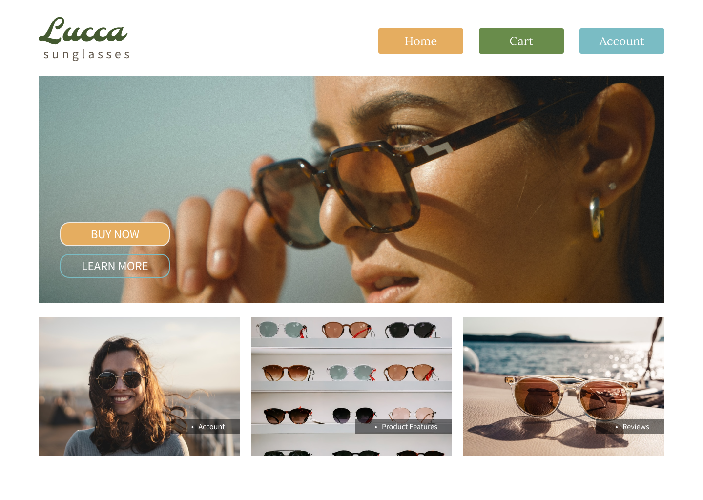 In this project, I designed an eCommerce site for Lucca Sunglasses, a fictional women’s sunglasses brand. I created this case study to practice my design skills and to immerse myself in a given user’s perspective, learn their needs and pain points, and cater a site’s design to meet their goals and facilitate a successful conversion. This practice in design and user empathy allowed me to apply and develop my skills in a realistic setting, preparing me to build better projects in the future.