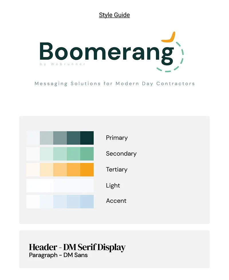 We've acquired a new white-labeled software solution that we can tailor and introduce to our customers. We've decided to come up with a new name for the application (Boomerang) and would like to build a few brand assets we can leverage to bring this software to market. Since this is a product we'll be reselling, we want the new brand to follow Webrunner's existing style guide. In fact, we'd probably consider adding "by Webrunner" to the logo.