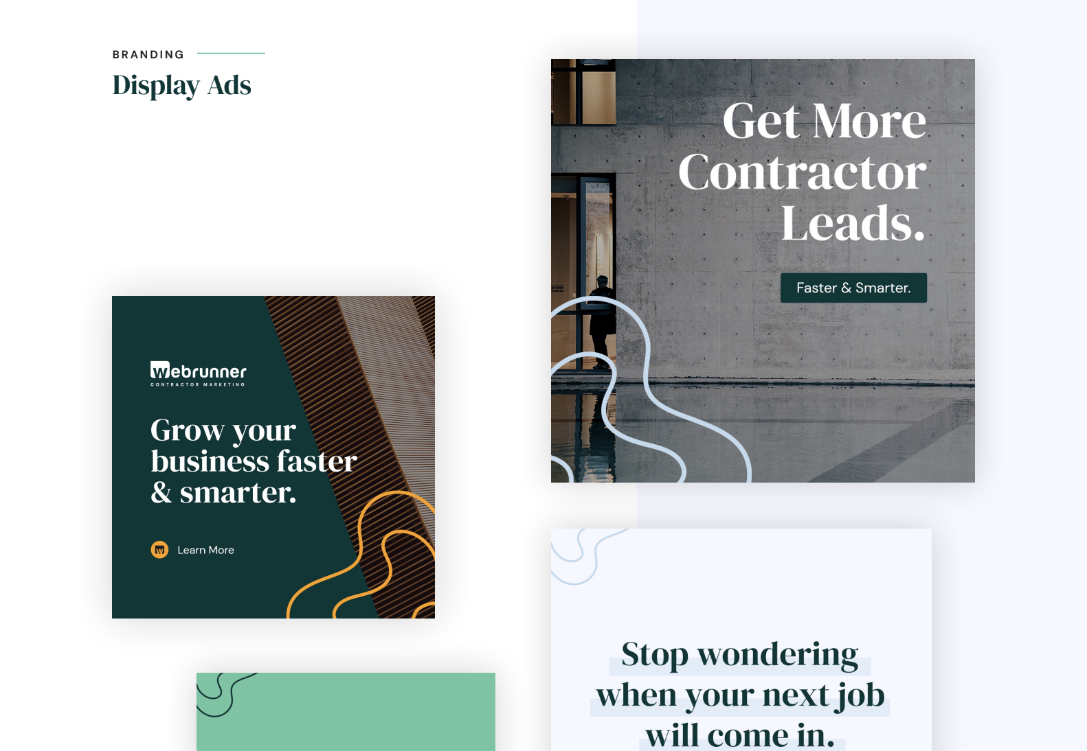 I felt the design was almost complete, but I wanted to imbue the design with a sense of motion. Boomerang’s purpose is for contractors to follow up with leads through a series of automations after the initial form submission to convert those leads to sales. The lead will see an ad, submit their info, and presumably go on with their lives, but the series of automated reminders and follow-ups (texts, emails, etc) will eventually circle the lead back to the contractor (thus the name “Boomerang”). To create this sense of motion, I added a dashed line trailing the boomerang illustration. While the agency mostly uses wavy lines in their designs, I opted for a circle to mimic the movement of a boomerang and to symbolize the platform’s cyclical targeting of leads. The line further helped balance the discrepancy in roundness I previously described, and emulated a loading screen pinwheel, emphasizing the platform’s goal of progress in the digital sphere. Satisfied with the layout, I moved on to colours.